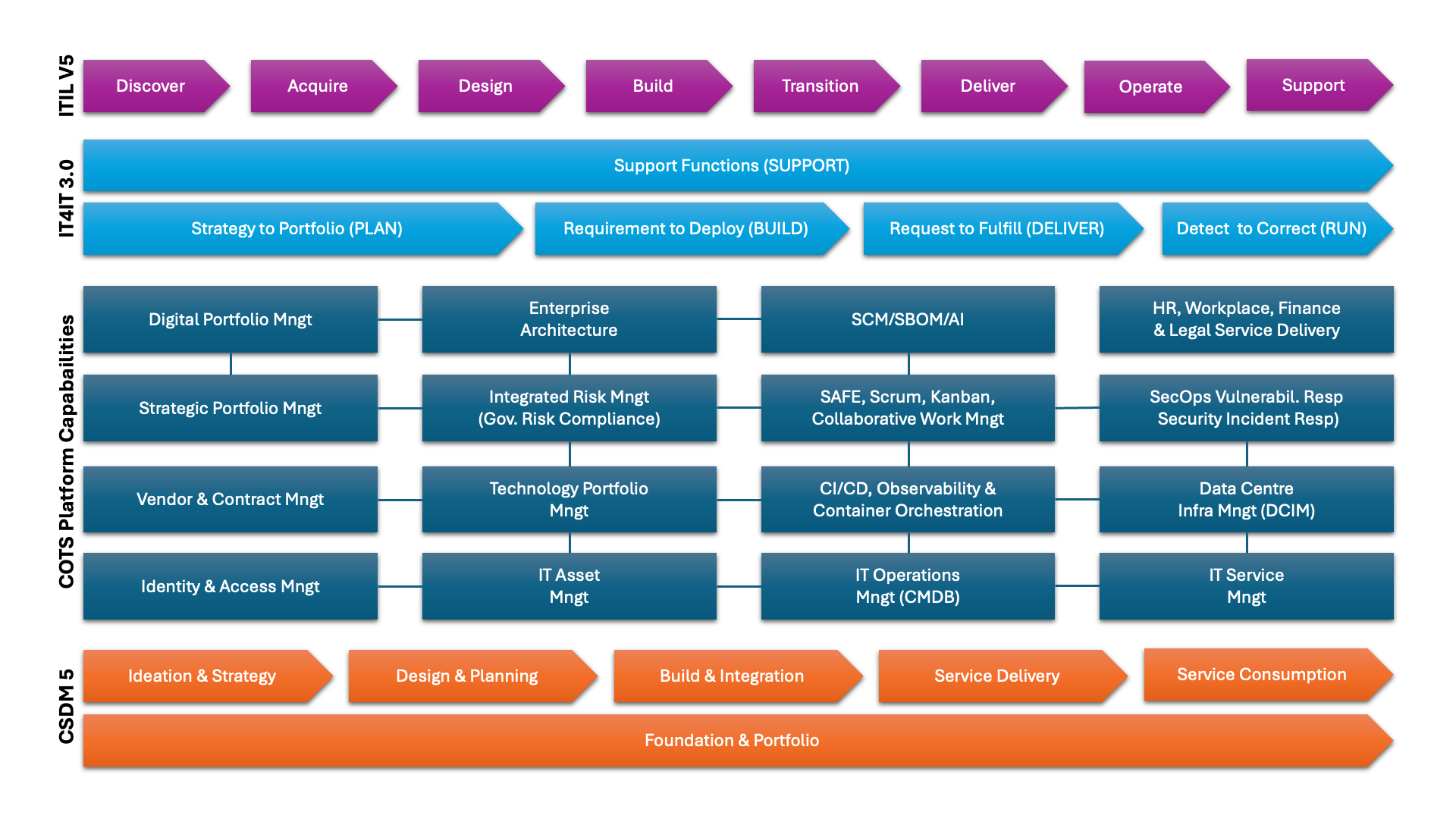 ITIL Version 5 was published in February 2026, and now people ask me how that aligns with DevSecOps and CSDM5. The honest answer is: There appears to be no real alignment. At best, one can produce a matrix like the one below. As you can see, a CSDM5 domain can include multiple ITIL Version 5 lifecycles. An ITIL Version 5 Livecycle can apply to multiple CSDM5 domains. Things get even fuzzier when I try to map ServiceNow products and ServiceNow ITIL practices to either of them. From a satellite, it looks like things are similar, but the closer you get to real life, the bigger the differences and confusion appear to be.